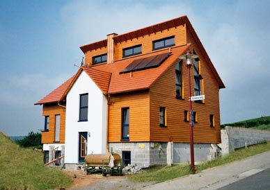 Das Musterhaus „Sunrise“ komplett in Holzoptik.
